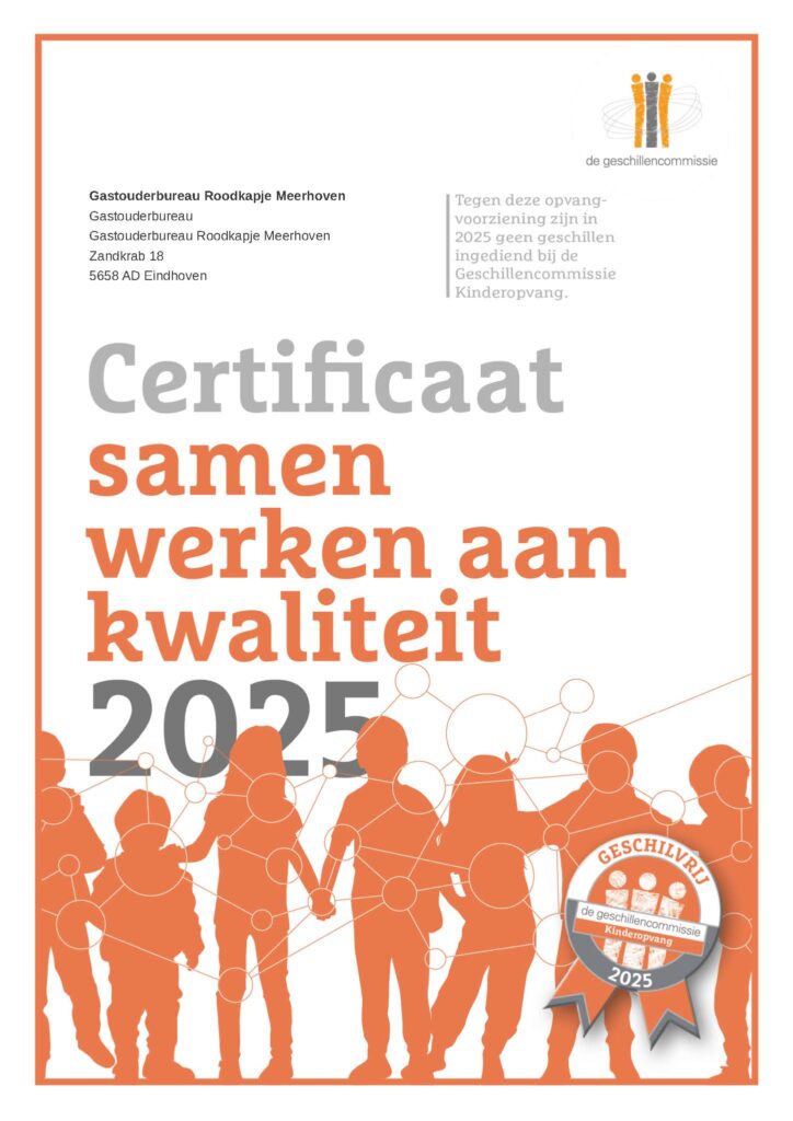 Dit certificaat wil zeggen dat er in 2024 geen klachten over Gastouderbureau Roodkapje Meerhoven zijn ingediend bij de Geschillencommissie Kinderopvang.